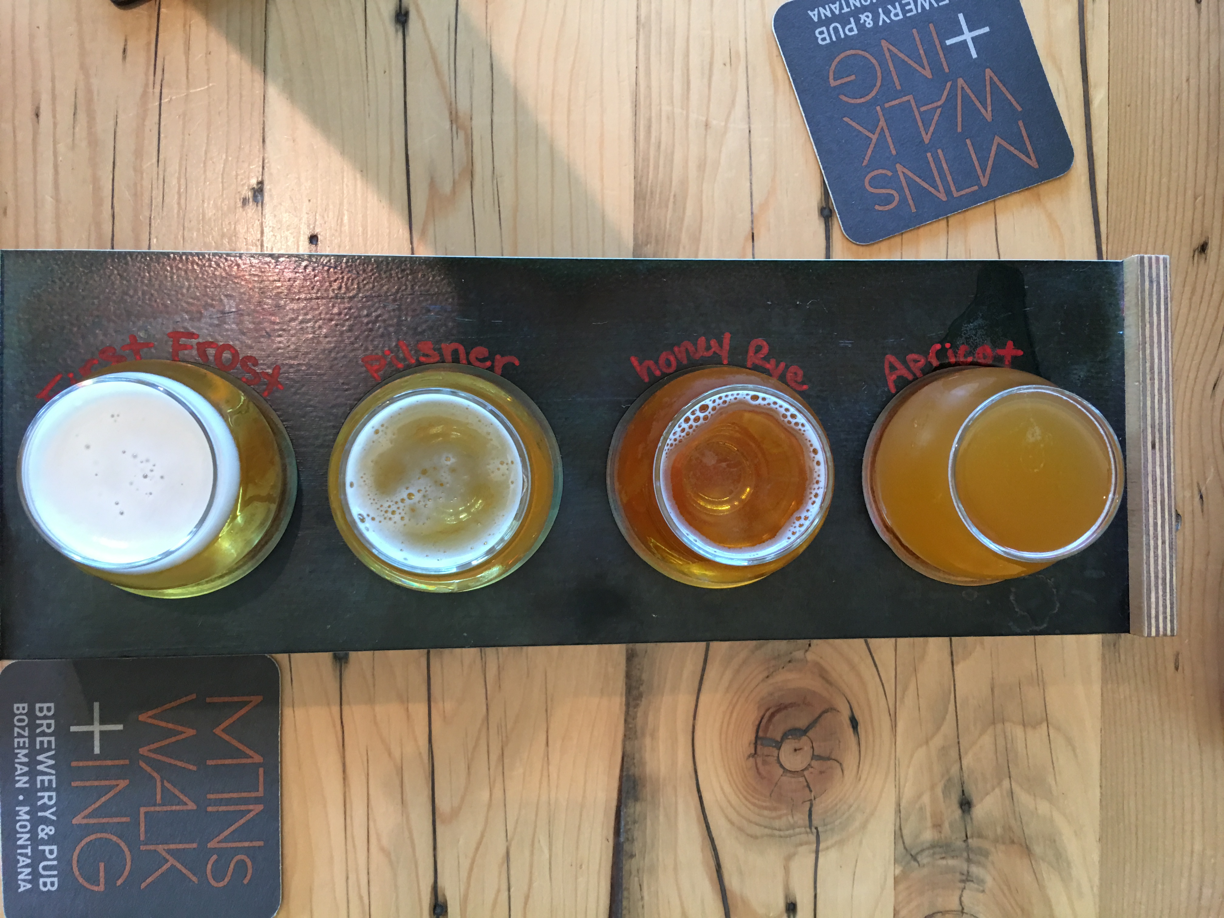 Honestly, overall really good beers! The apricot sour was my favorite and it was sour – as a Hawaii reference, it tasted a lot like li hing powder. The honey rye was my second favorite and had a great balance of the honey flavor without being too sweet. The nitro was great in taste (I’m just still not sure I like nitros – they always seem flat to me) and the pilsner was good also but a bit on the hoppy side for a pilsner. I would definitely say this brewery is worth a visit and it’s located very near Bozeman Brewing Company.