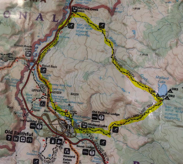 Both locations are near Old Faithful (an hour and a half drive from the north end of the park) and we chose Mallard Lake for the slightly longer hike. The trail was an 11 mile loop starting and ending near the Old Faithful parking lot. The trail had a modest 700 ft of elevation gain and three (single?) campsites OB2, OB3, and OB4 next to the lake (unfortunately, as I’ll later explain). It’s 8 miles to the sites on the western leg and 3.5 miles to the site on the eastern leg. Essentially the lake is at the highest elevation, so we did the longer portion our first day (all uphill) in just a little over three hours and the shorter leg the next morning (all downhill) in under 2 hours.