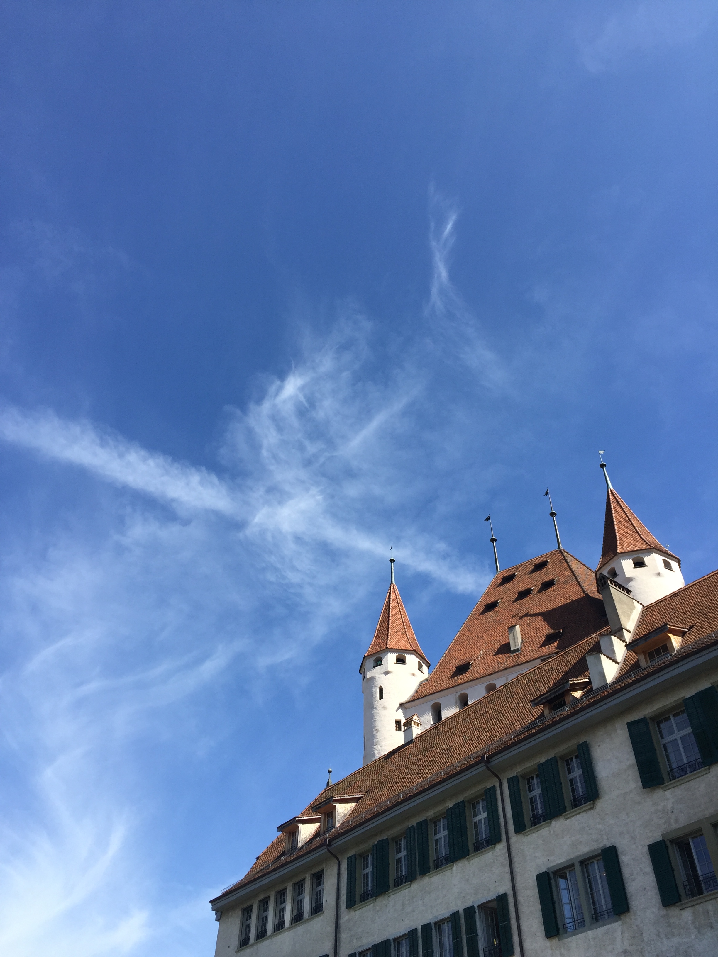 From here, I took the train to Thun, which is a small medieval city with one adorable street, men weirdly surfing in the river, and a darling picture-book castle. Particularly with having seen a hamlet just the day before, I could strongly picture being a medieval villager, coming to Thun, and being awestruck by the “huge” buildings and city bustle. The old town area is clustered in one section on a hill, so it’s easy to mentally strip away the newer parts of the small city.