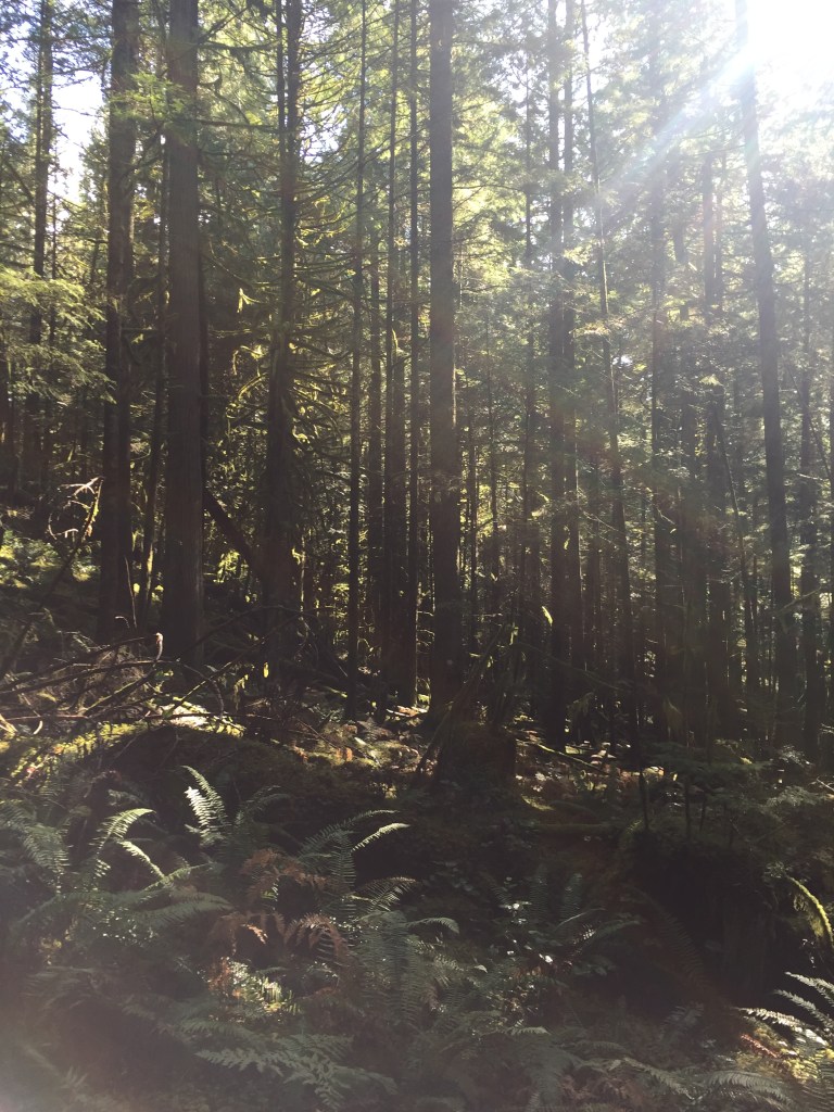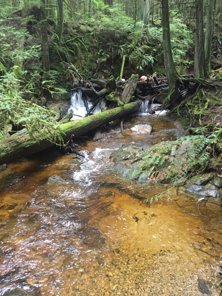 In the afternoon after his online session, we took a short walk through Cliff Gilker Park in Roberts Creek. It was a smaller park but had some lovely small waterfalls (with a lot of iron? in the water) and lots of signs warning of a local coyote pack (leading, of course, to logistical discussions about how we’d try to fend off a pack of coyotes).
