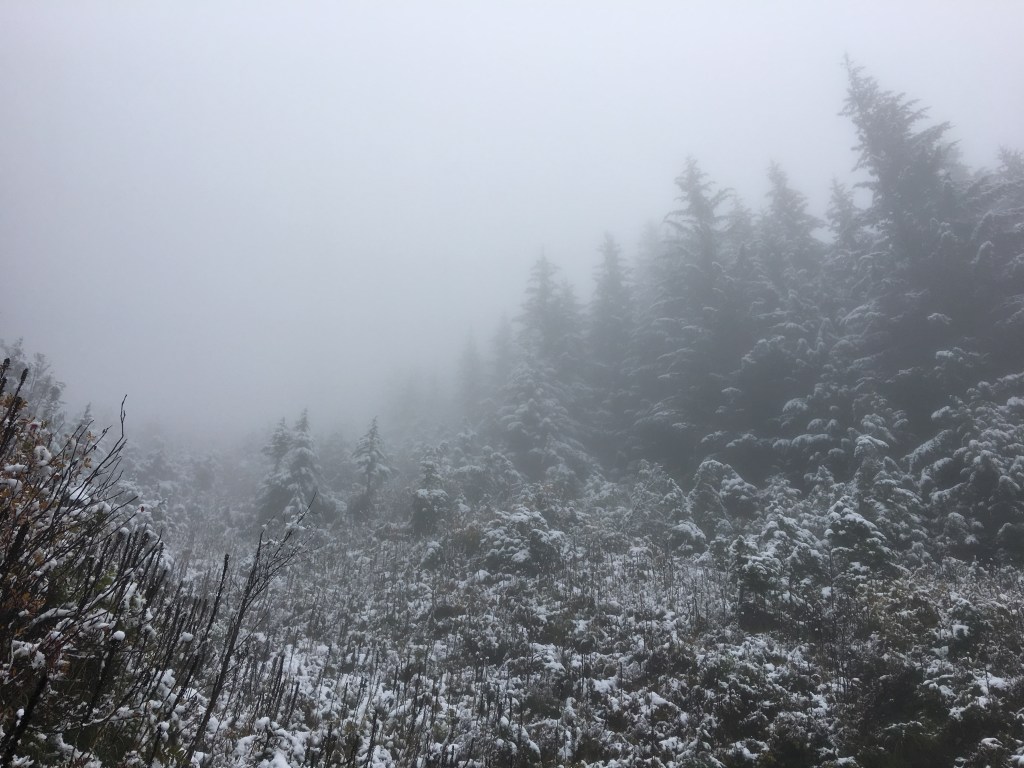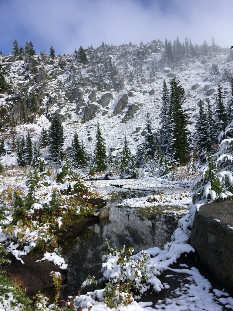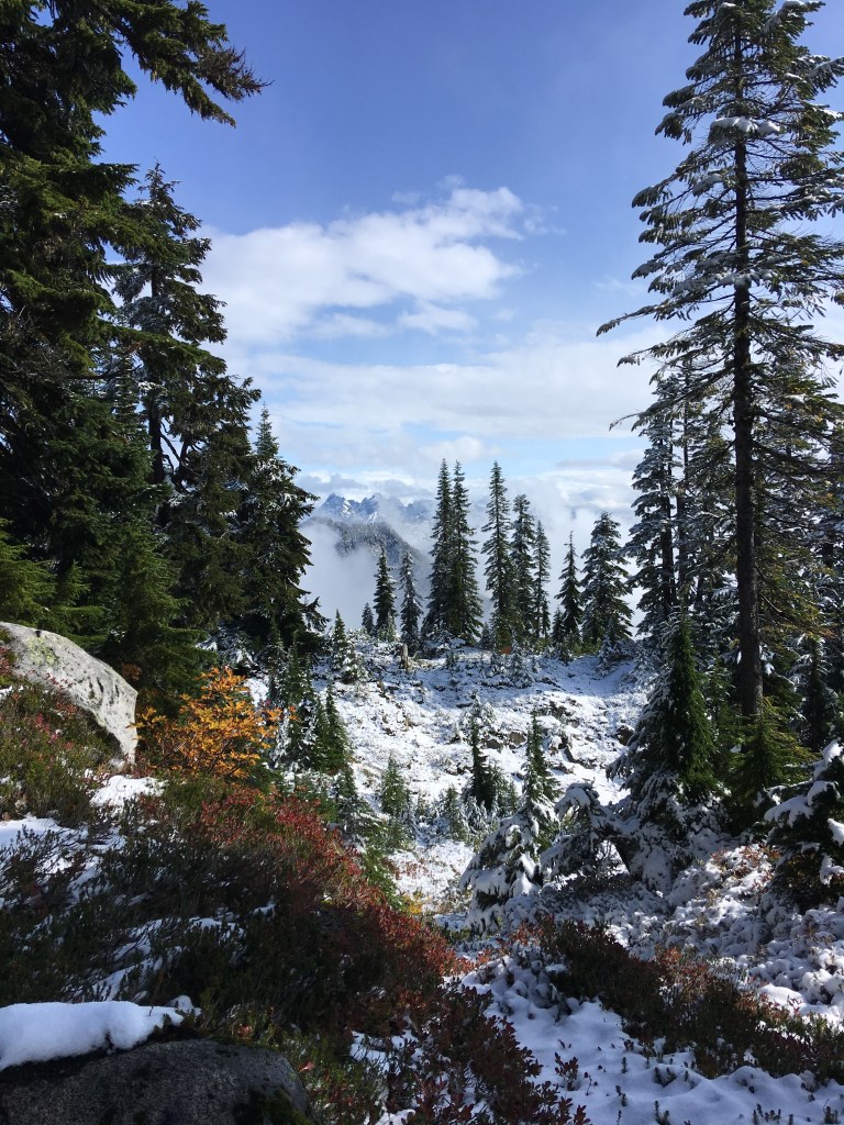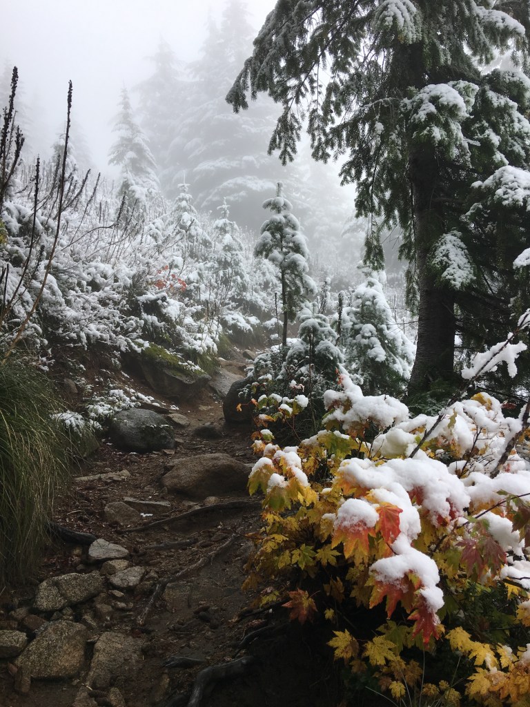 We joked that we felt like we were moving through all the seasons on the hike – starting out in “summer,” moving up through “autumn” (where the leaves were changing), then through “winter” (with snow-covered evergreens), and then even back into “spring” at the top of the hike where the snow was melting.