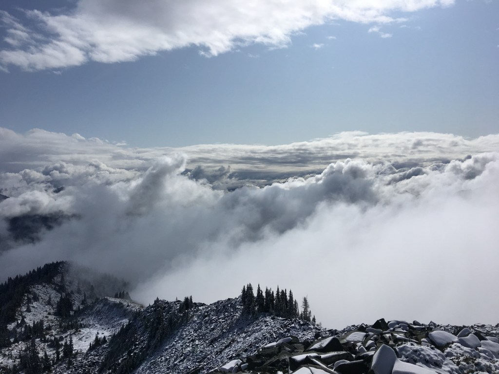 We didn’t have much view as we were ascending until we neared the peak and were above the cloud cover and then we got really stunning views of the clouds (my friend who is a pilot kept remarking that he felt like he was in a plane) and the Cascades. The peak is the very definitive ending of a lookout tower you can’t enter but has great rocks next to it to sit down on to eat lunch. We sat there for a bit soaking up the view until our fingers got too cold and we had to start moving again to warm up.