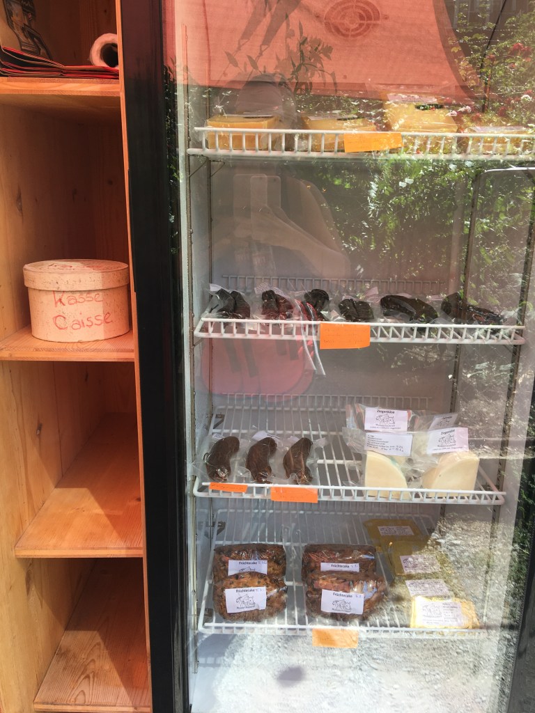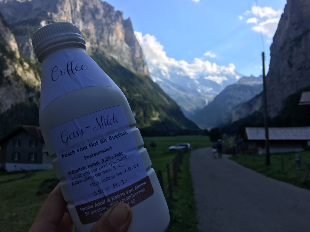 My second favorite part of the hike is walking along the Lauterbrunnen valley and 30 minutes from Lauterbrunnen you hit the last dairy fridge, which is a vending machine with goat milk products (I love the goat coffee milk).