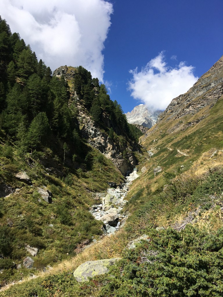 We wanted to go back into Zermatt through Zmutt (a small medieval hamlet) and I was trying to replicate what I did last time but accidentally stayed on the left bank of the river instead of the right, so we added another 30 minutes of walking into the route and walked far above the dam instead of next to it. (I would recommend trying to stay on the right bank.)