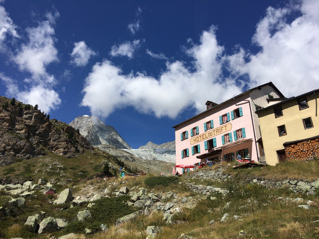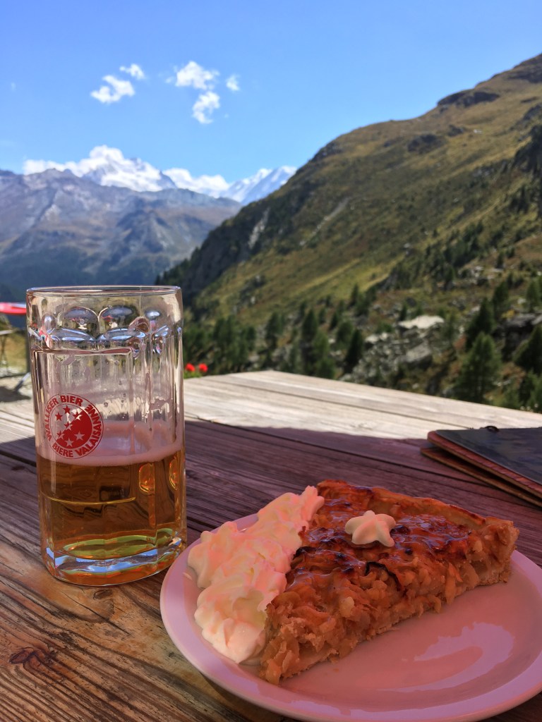 The trailhead is quite difficult to find at the start but you start by heading up to Hotel Edelweiss Zermatt (where you can stop and grab a drink), then up a rocky hillside next to a river, before heading to Trift where you can stop at Hotel Du Trift. This was one of my favorite stops last time as well as it’s so picturesque and everyone there was getting the apple pie/cake and the house-brewed iced tea (which contains fruit juice as well) so we grabbed those both and some beers for a nice long stop with a gorgeous view. This was one of our favorite parts of the day and even if you ended your hike here (which some folks do), it’s definitely worth the climb!